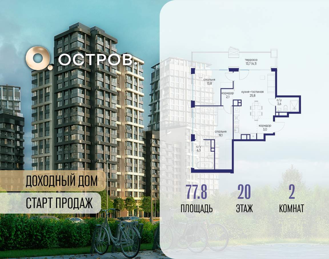Продаётся 2-комн. квартира от застройщика: общая площадь 77.80 м, жилая 32.90 м, кухня 25.80 м, 20-й этаж, жилой квартал «Остров 14», корпус 6 (секция 1) . Срок сдачи: 2 квартал 2029 года.