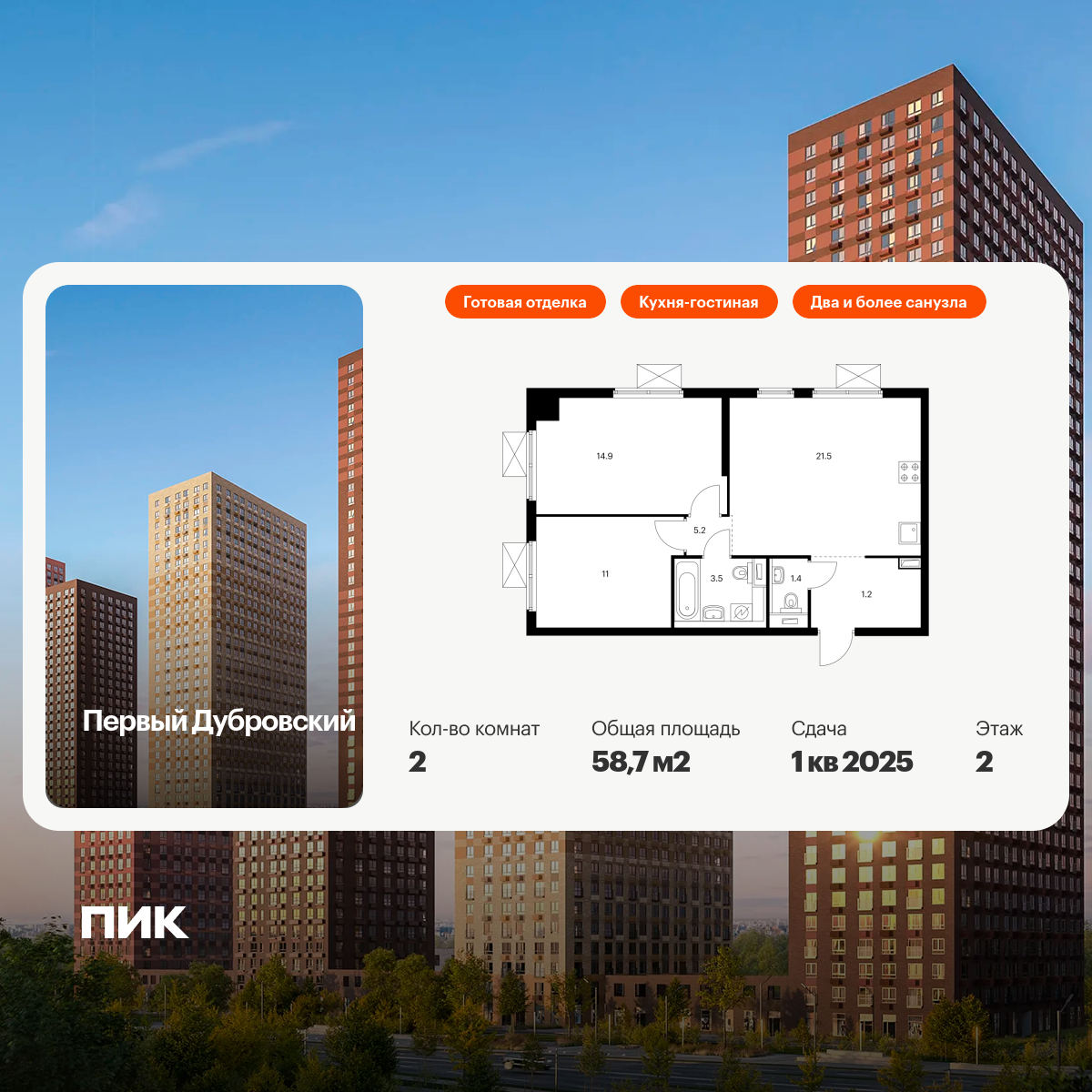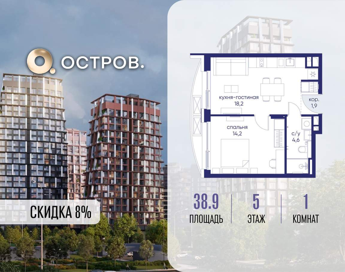 Продаётся 1-комн. квартира от застройщика: общая площадь 38.90 м, жилая 14.20 м, кухня 18.20 м, 5-й этаж, жилой квартал «Остров 14», корпус 1 (секция 1) . Срок сдачи: 2 квартал 2029 года.