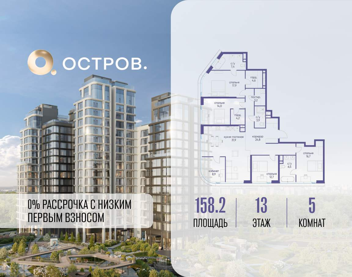 Продаётся квартира от застройщика: общая площадь 158.20 м, жилая 70.20 м, кухня 31.90 м, 13-й этаж, жилой квартал «Остров 12», корпус 3 (секция 1) . Срок сдачи: 1 квартал 2029 года.