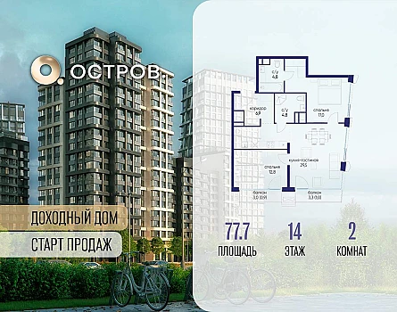 Продаётся 2-комн. квартира от застройщика: общая площадь 75.50 м, жилая м, кухня м, 8-й этаж, жилой квартал «Остров 12», корпус 2 (секция 1) . Срок сдачи: 1 квартал 2029 года.