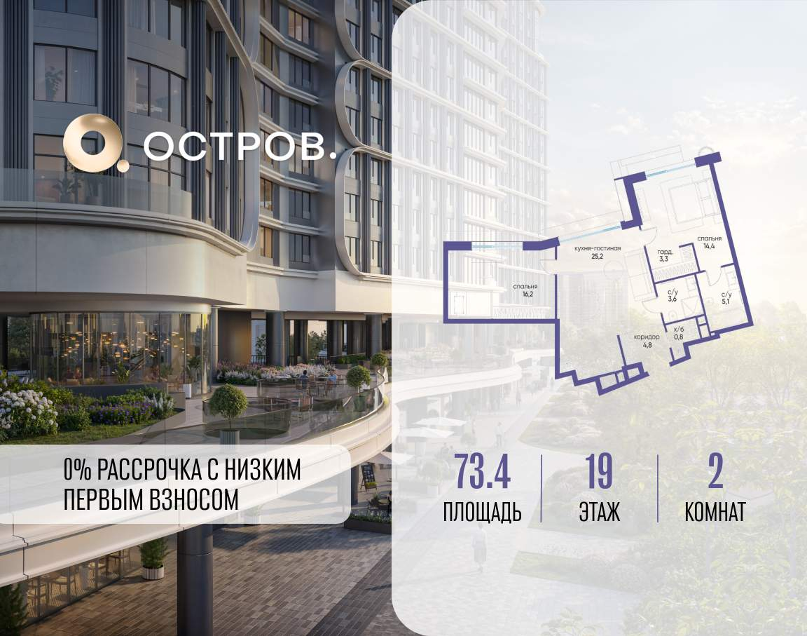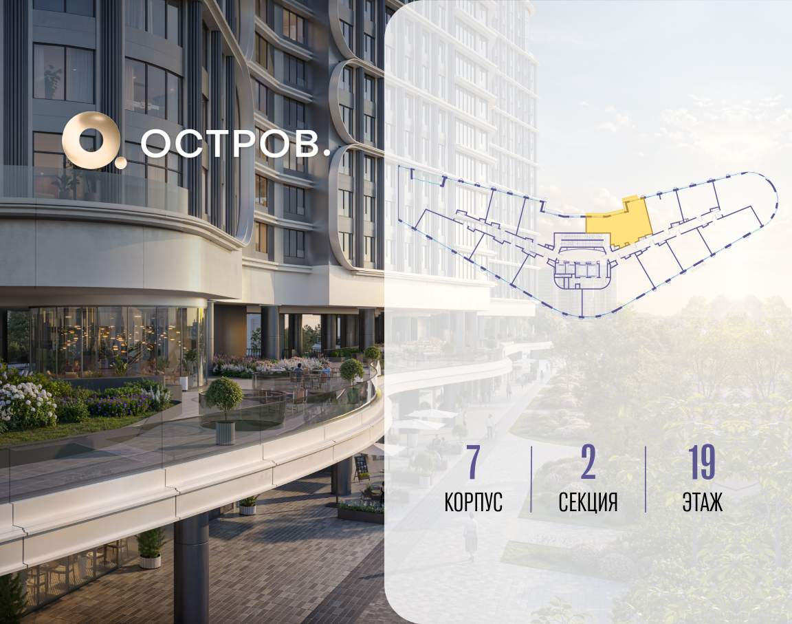 Продаётся 2-комн. квартира от застройщика: общая площадь 73.40 м, жилая 30.60 м, кухня 25.20 м, 19-й этаж, жилой квартал «Остров 7», корпус 7 (секция 2) . Срок сдачи: 3 квартал 2028 года.