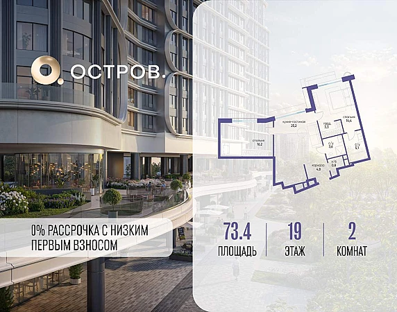 ОСТРОВ от Донстрой - жилой комплекс на западе Москвы, в Мневниковской пойме. Уникальное преимущество комплекса - в том, что он обособлен от города рекой и природным парком (650 га) . Благодаря природному окружению эта территория имеет лучший экологический рейтинг в столице. Кварталы ОСТРОВА объединены ландшафтным дизайном в единое пространство - с набережными и Центральным бульваром. На ОСТРОВЕ любые объекты, необходимые для полноценной жизни и отдыха, находятся на расстоянии 15-минутной прогулки. Торговый центр и супермаркеты, кафе и рестораны, фитнес, салоны красоты, школы и детские сады. А также крупнейший в Москве спортивный кластер.