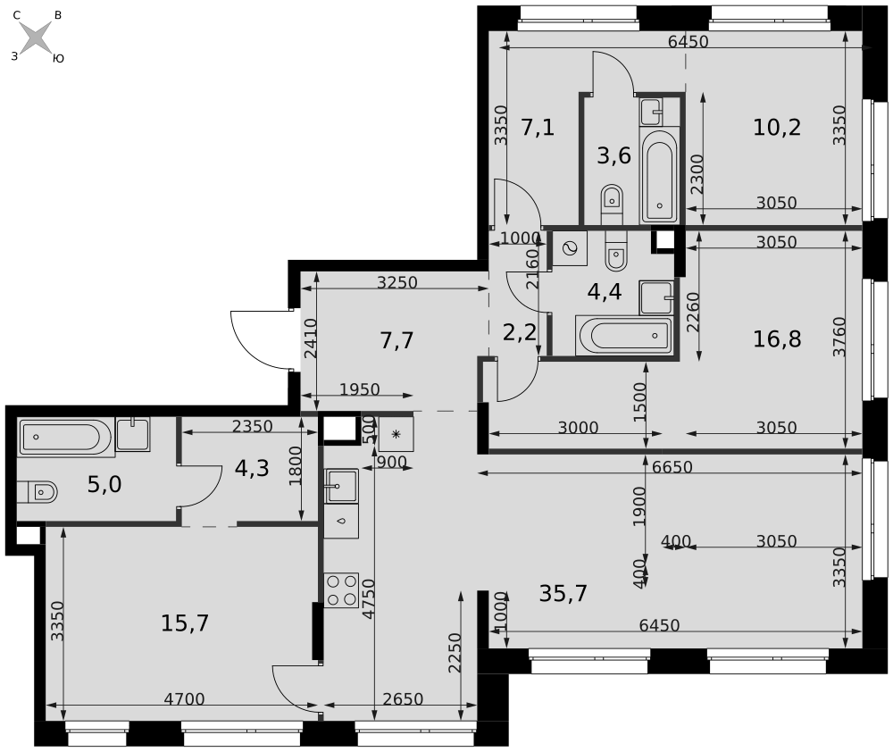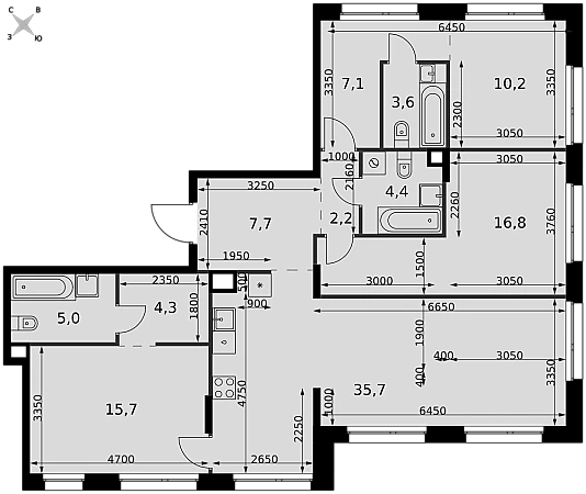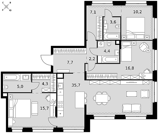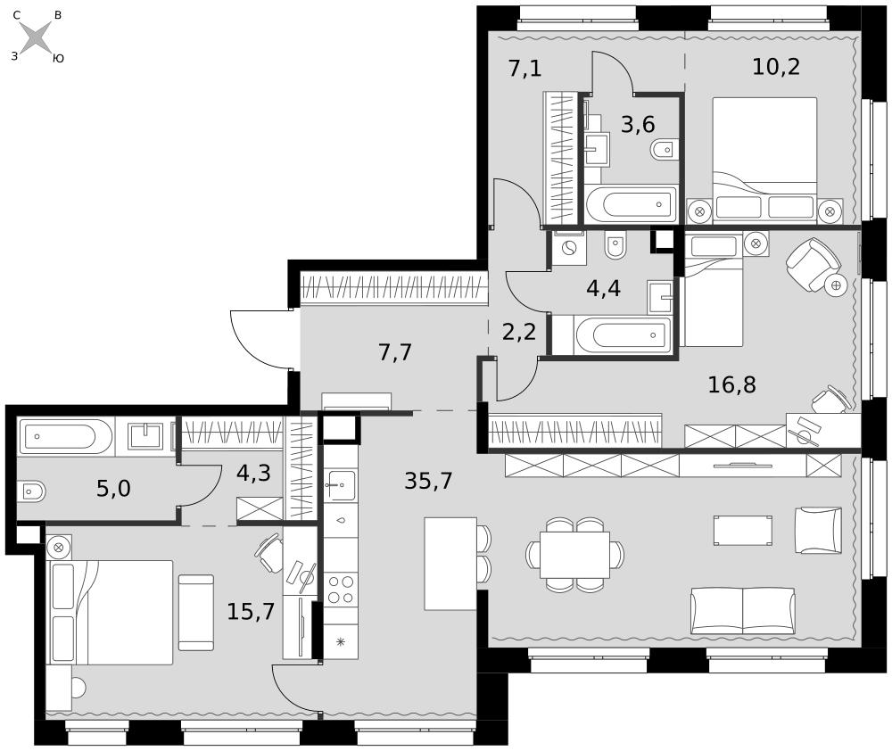 - Мастер-зона с санузлом и гардеробной. Всё для вашего комфорта и удобства, включая личный санузел и гардероб.