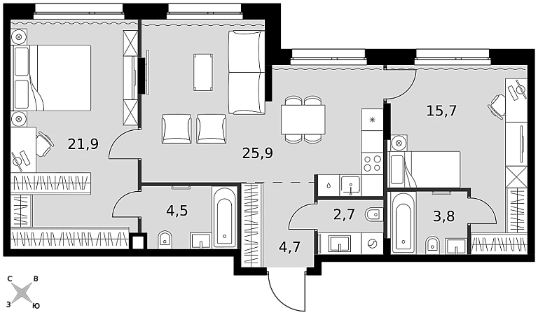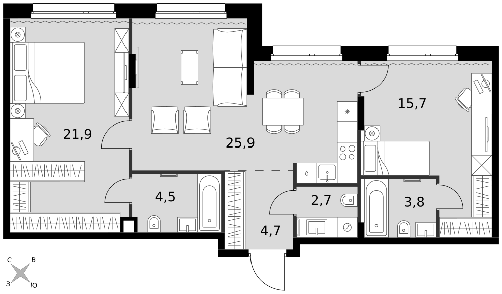 - Мастер-зона с санузлом и гардеробной. Всё для вашего комфорта и удобства, включая личный санузел и гардероб.