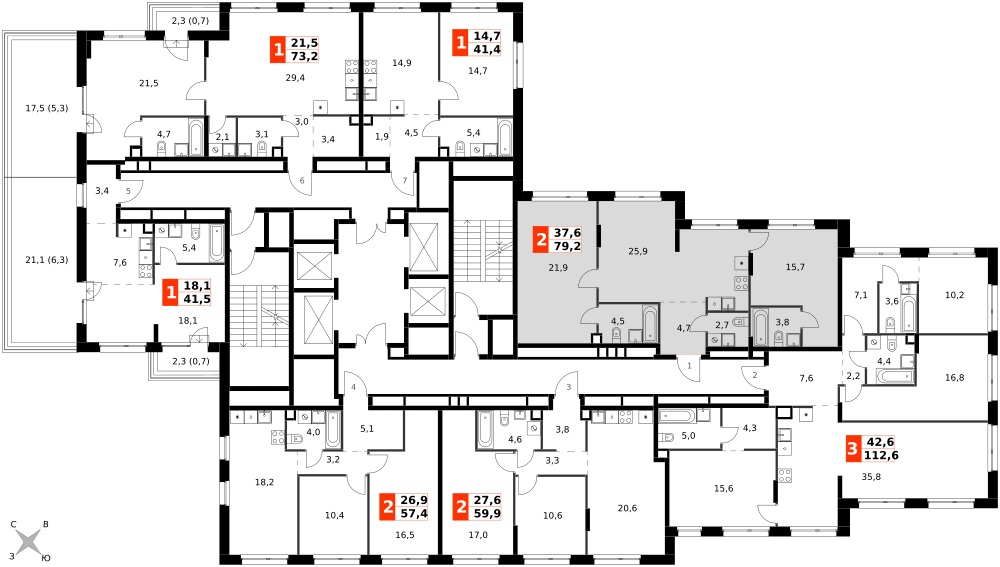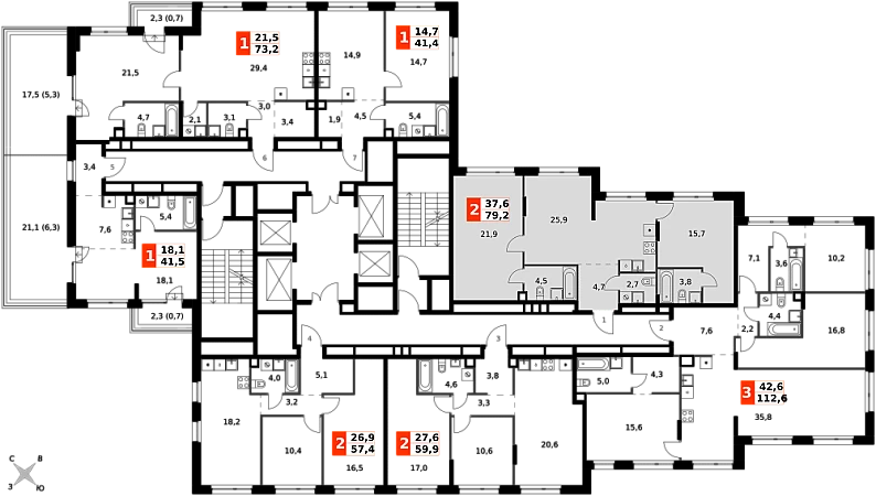 Продаётся 3-к квартира номер 234 общей площадью 79.2 кв.м. на 22-м этаже 27 этажного здания. Без отделки.