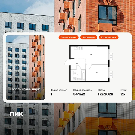 Продаётся 1-комн.квартира площадью 34.10 кв.м на 25 этаже 25 этажного дома (Корпус 12, секция 1) проекта ПИК Люблинский парк. Светлый просторный подъезд на уровне земли, функциональная планировка, большие окна, с отделкой.