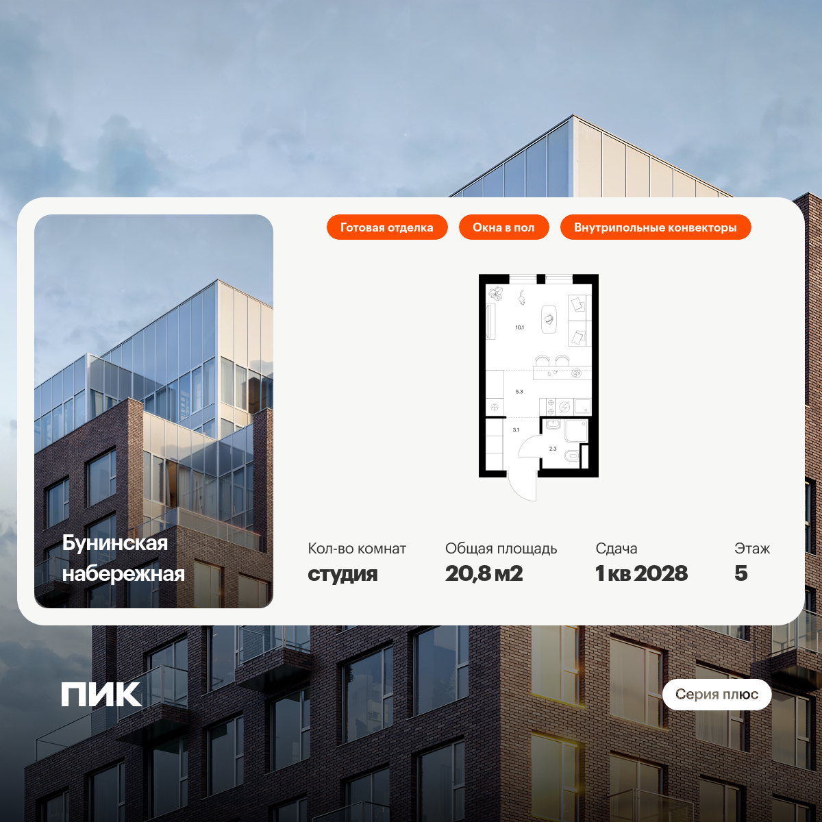 Продаётся квартира-студия площадью 20.80 кв.м на 5 этаже 16 этажного дома (Корпус 2.6/1.3, секция 3) проекта ПИК Бунинская набережная. Светлый просторный подъезд на уровне земли, функциональная планировка, большие окна, с отделкой.