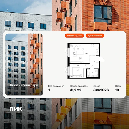 Продаётся 1-комн.квартира площадью 41.20 кв.м на 18 этаже 25 этажного дома (Корпус 17, секция 1) проекта ПИК Люблинский парк. Светлый просторный подъезд на уровне земли, функциональная планировка, большие окна, с отделкой.