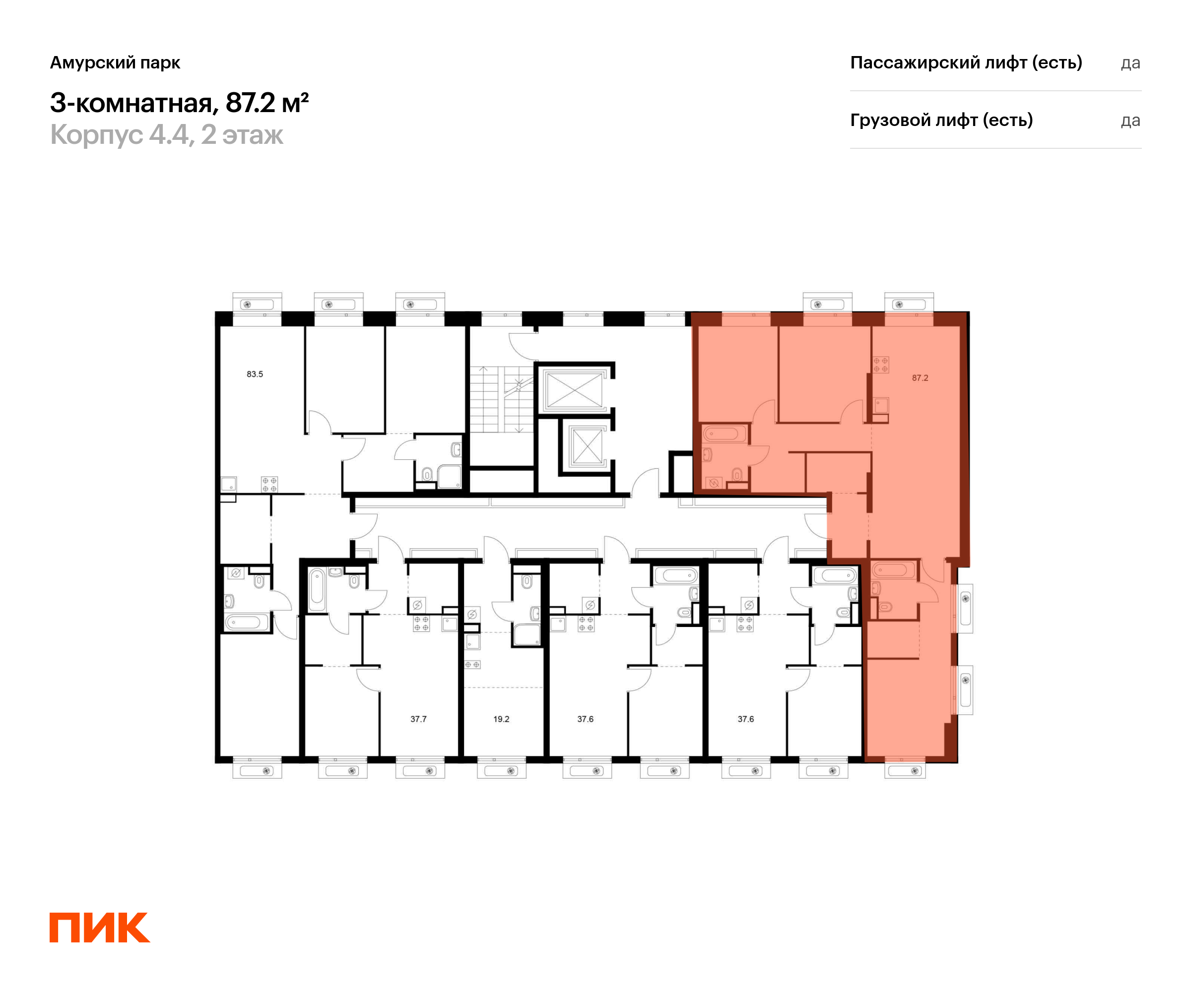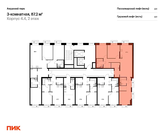 Продаётся 3-комн.квартира площадью 87.20 кв.м на 2 этаже 19 этажного дома (Корпус 4.4, секция 5) проекта ПИК Амурский парк. Светлый просторный подъезд на уровне земли, функциональная планировка, большие окна, с отделкой.