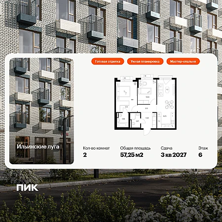 Продаётся 2-комн.квартира площадью 57.25 кв.м на 6 этаже 9 этажного дома (Корпус 4.1, секция 3) проекта ПИК Ильинские луга. Светлый просторный подъезд на уровне земли, функциональная планировка, большие окна, с отделкой.
