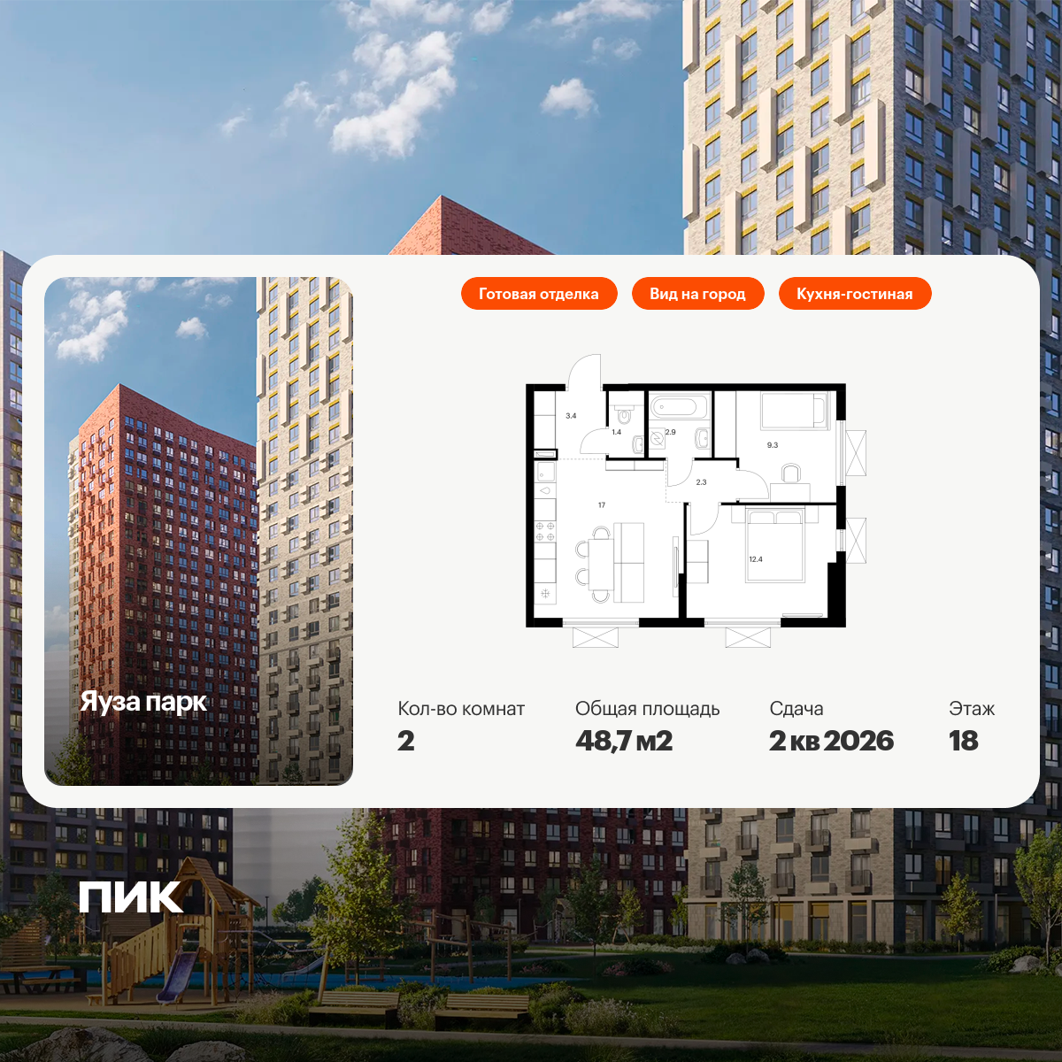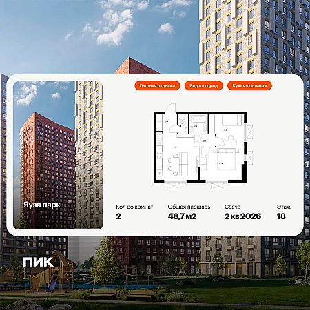 Продаётся 2-комн.квартира площадью 48.70 кв.м на 18 этаже 24 этажного дома (Корпус 5, секция 1) проекта ПИК Яуза парк. Светлый просторный подъезд на уровне земли, функциональная планировка, большие окна, с отделкой.