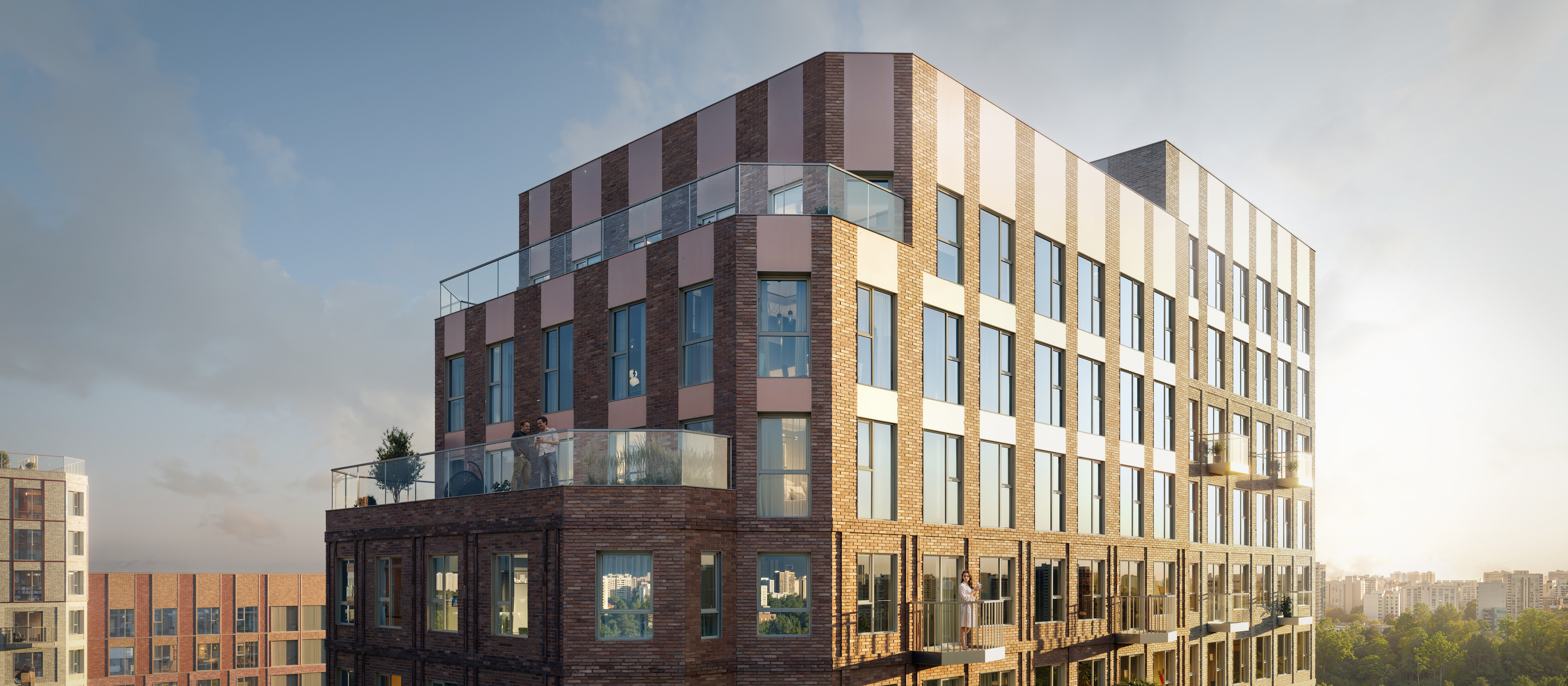Архитектурная концепция от бюро «ХАДА-АРХИТЕКТС» объединяет в проекте акцентные высотные корпуса и малоэтажные здания. Квартал выделяется за счёт узнаваемого силуэта фасадов с цветовыми акцентами и продуманных внутренних пространств.