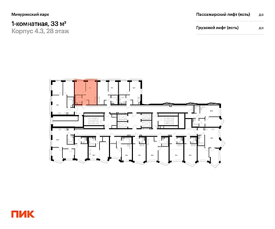Продаётся 1-комн.квартира площадью 33.00 кв.м на 28 этаже 31 этажного дома (Корпус 4.3, секция 2) проекта ПИК Мичуринский парк. Светлый просторный подъезд на уровне земли, функциональная планировка, большие окна, с отделкой.