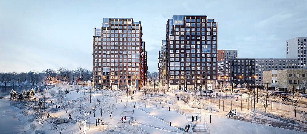 Архитекторы вдохновились локацией проекта: природные оттенки и активная пластика корпусов напоминают рельефные выступы на берегу, а окна отражают водную гладь, визуально объединяя дома с природой.