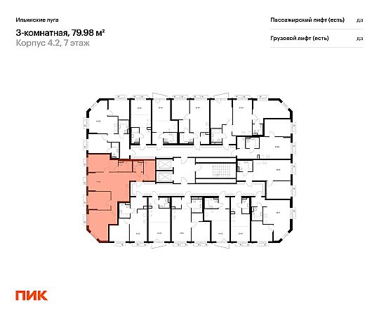 Продаётся 3-комн.квартира площадью 79.98 кв.м на 7 этаже 9 этажного дома (Корпус 4.2, секция 2) проекта ПИК Ильинские луга. Светлый просторный подъезд на уровне земли, функциональная планировка, большие окна, с отделкой.