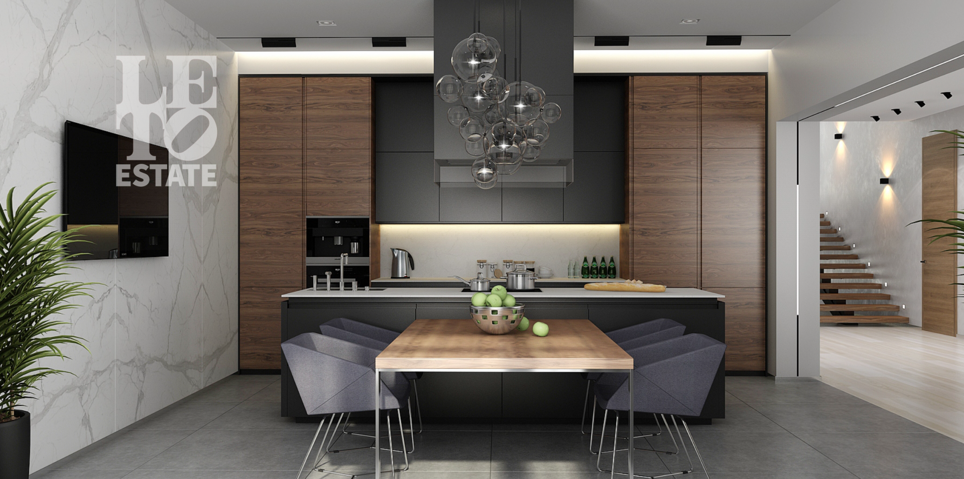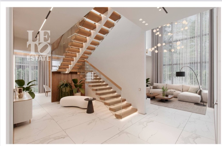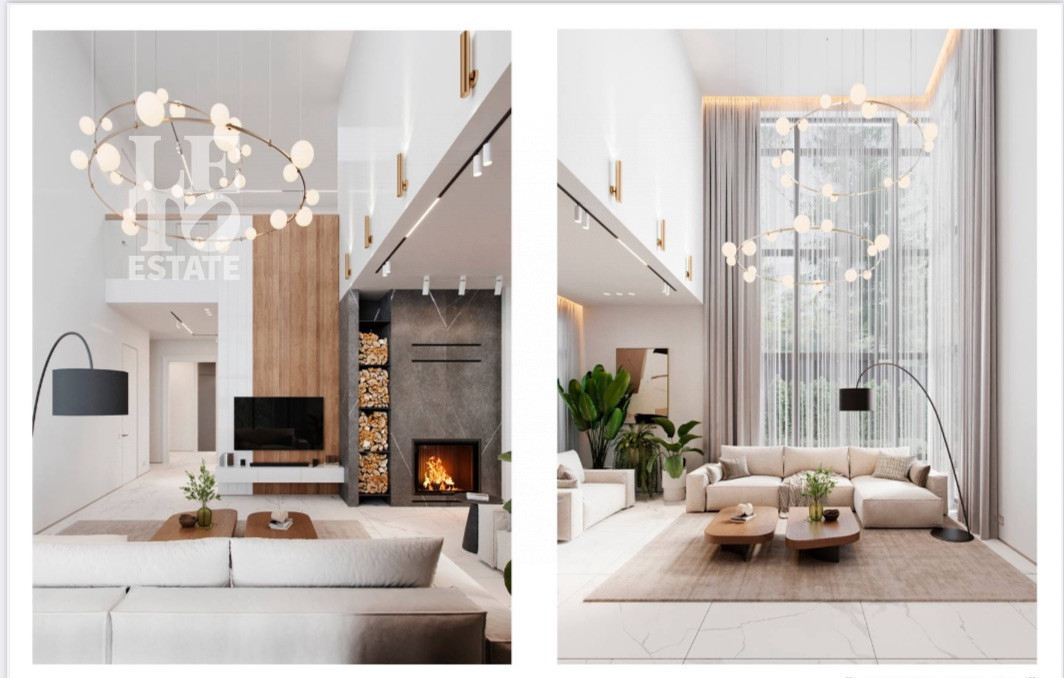 В доме мультифункциональное, панорамное остекление с заполнением аргоном, на уличных террасах напольное покрытие из керамогранита, предусмотрено фасадное освещение.