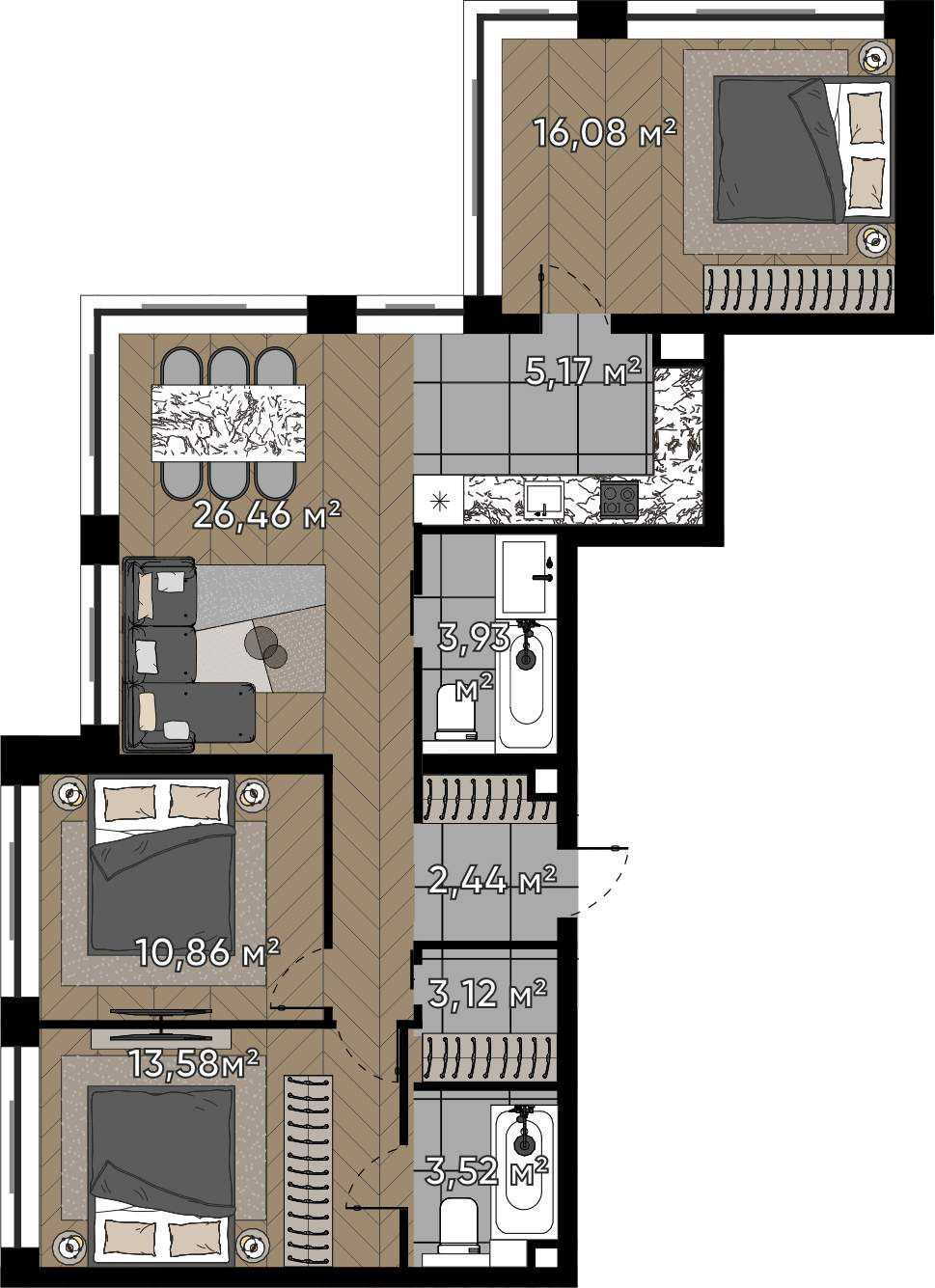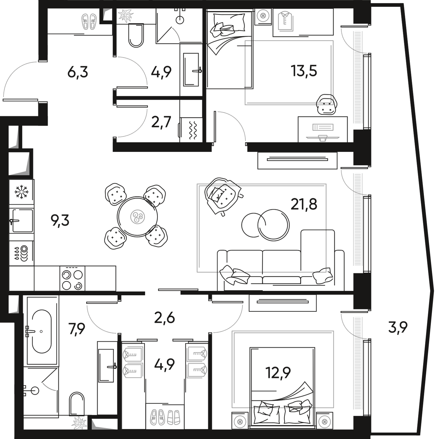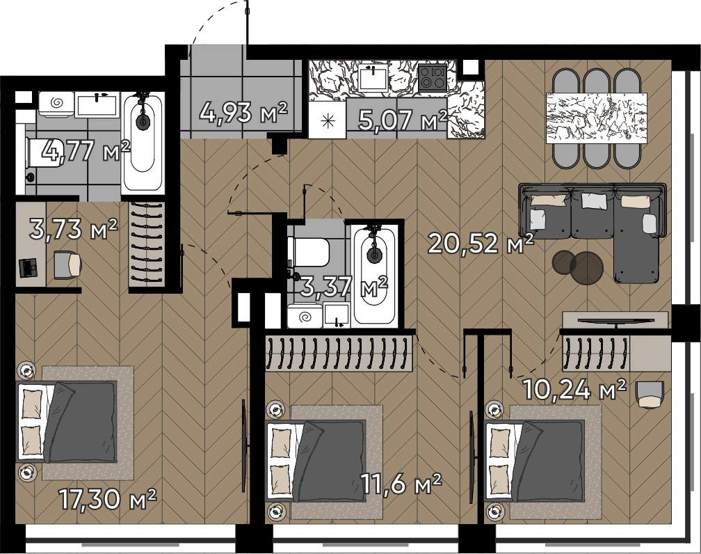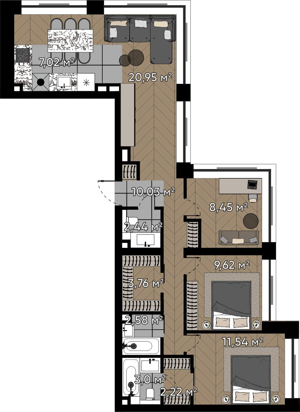 Планировочное решение угловой квартиры: -просторная кухня-гостиная,