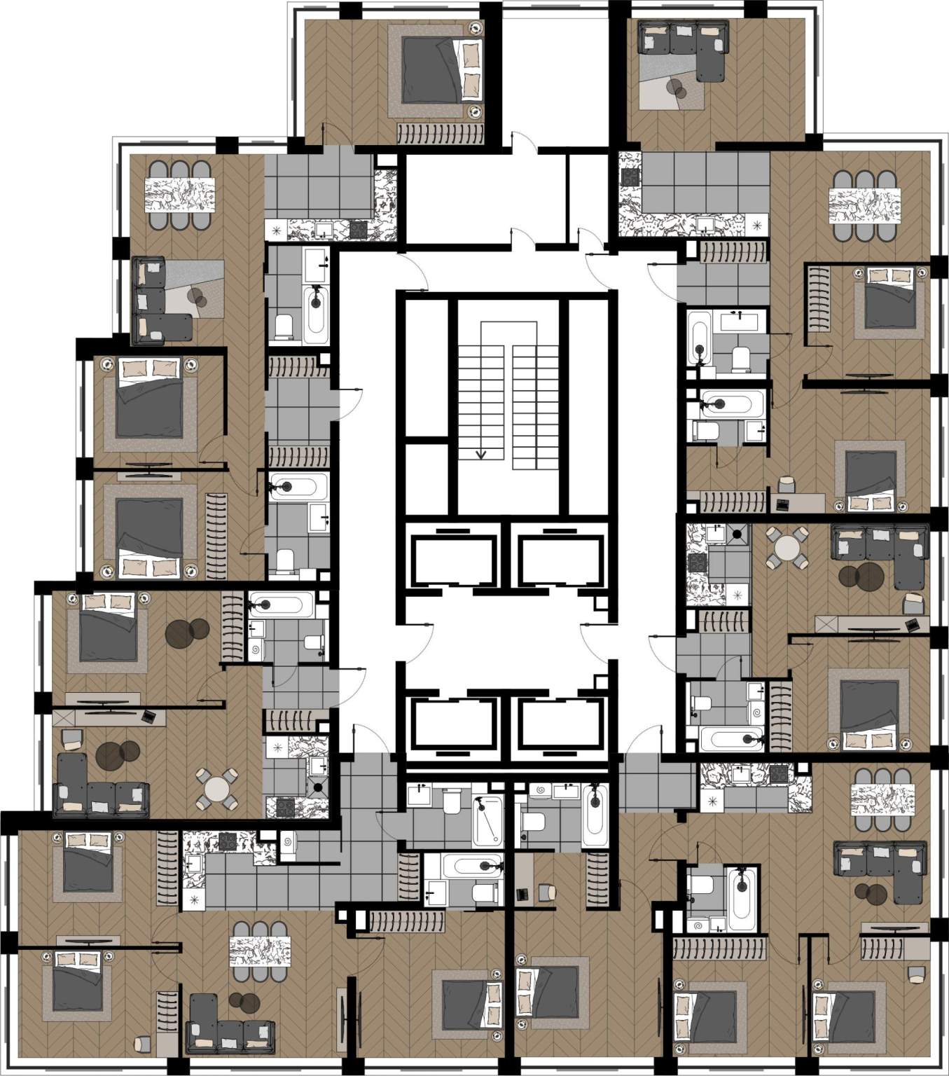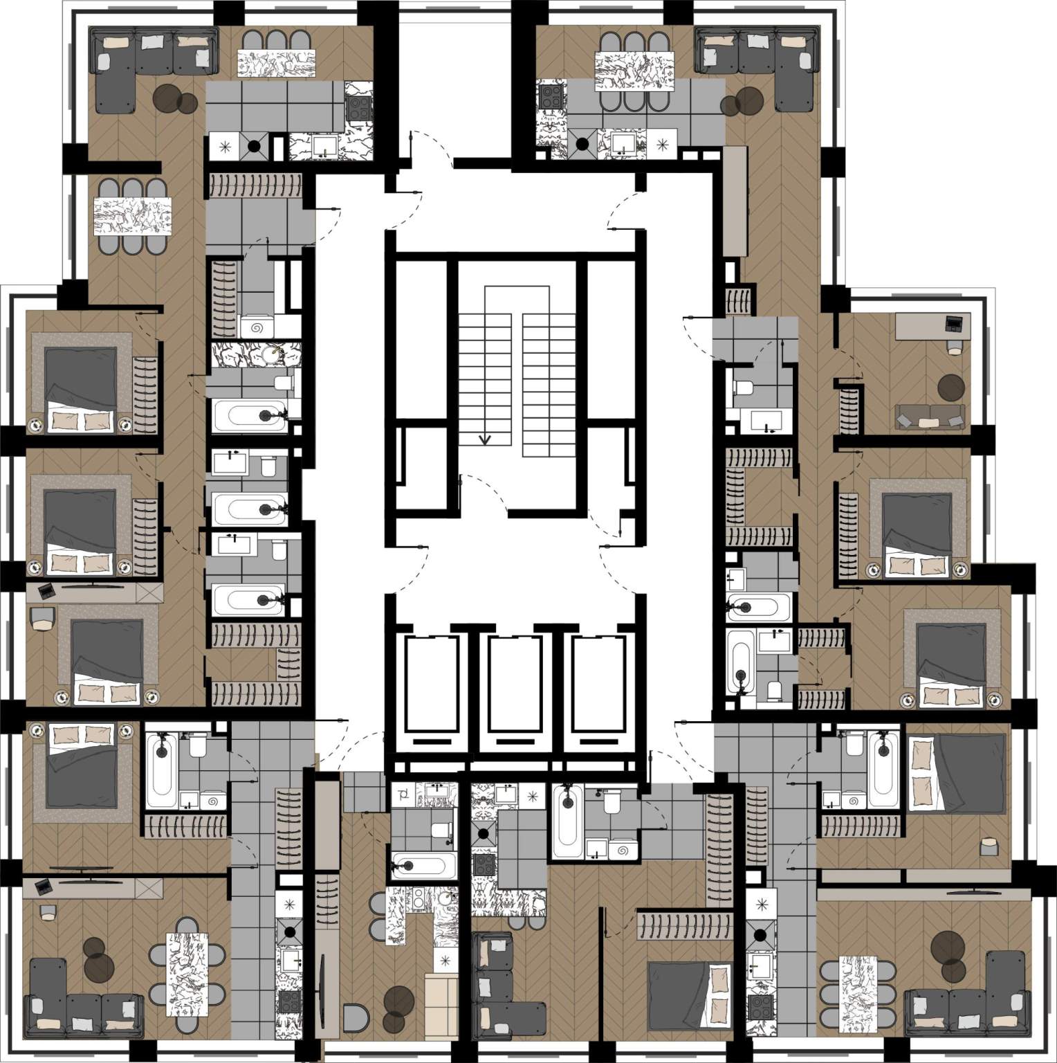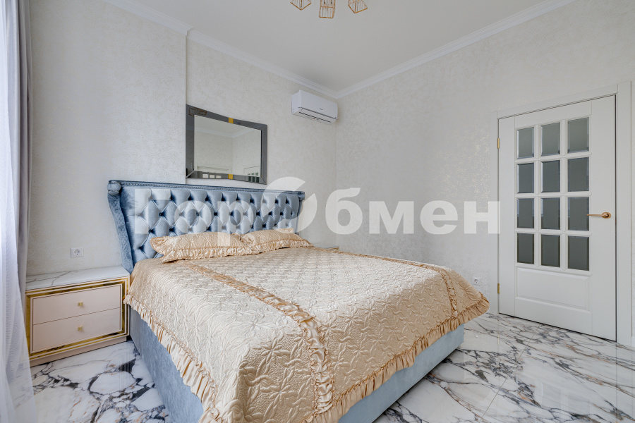 В отделке использованы: фактурная штукатурка с золотом ручной работы(стены), крупноформатный керамогранит с дизайном мрамор, натуральный камень кварц и мрамор, межкомнатные двери из массива ольхи, премиальные хрустальные люстры из Италии и многое другое.