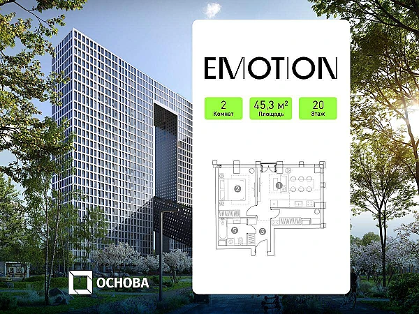 Продаются 2-к апартаменты площадью 45.3 кв.м. на 20-м этаже 28 этажного дома в "Emotion" от ГК ОСНОВА
