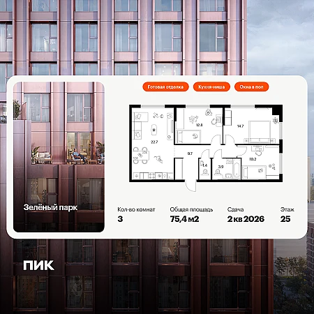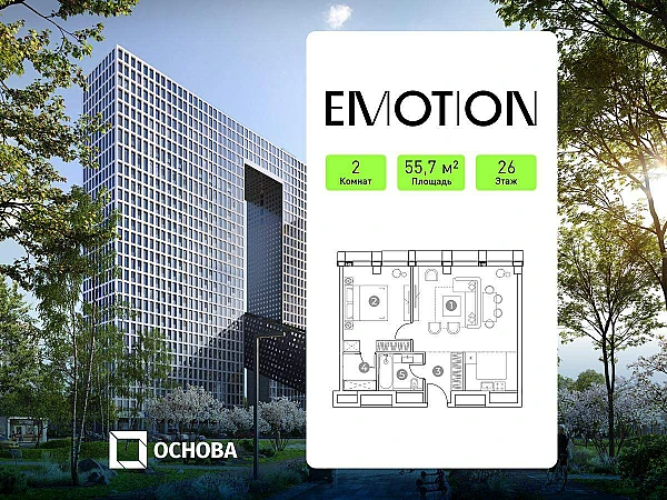 Продаются 2-к апартаменты площадью 55.7 кв.м. на 26-м этаже 28 этажного дома в "Emotion" от ГК ОСНОВА
