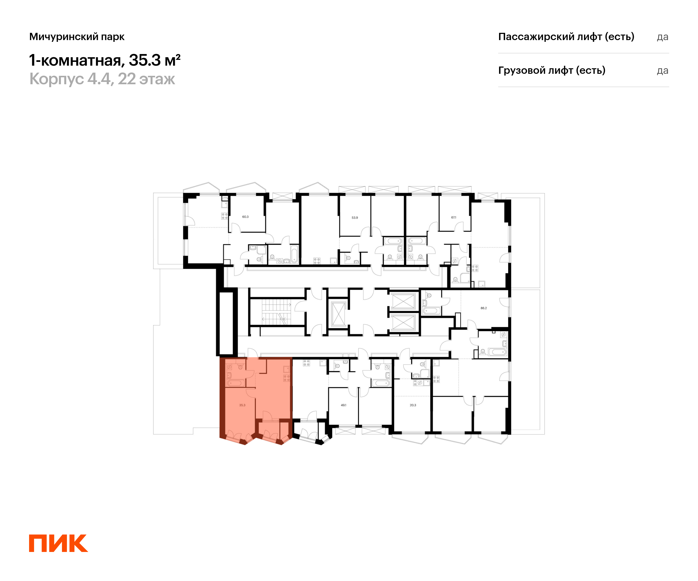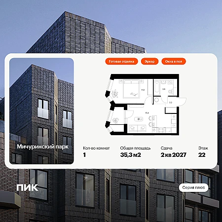 Продаётся 1-комн.квартира площадью 35.30 кв.м на 22 этаже 23 этажного дома (Корпус 4.4, секция 1) проекта ПИК Мичуринский парк. Светлый просторный подъезд на уровне земли, функциональная планировка, большие окна, с отделкой.