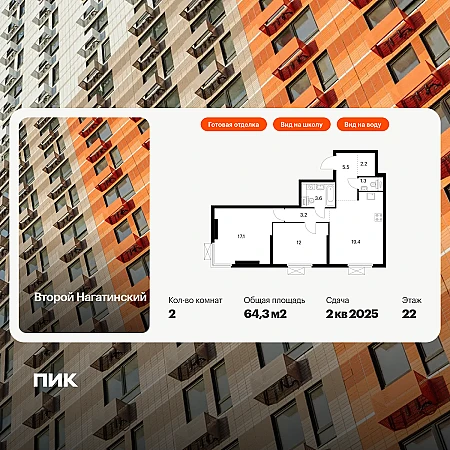 Продаётся 2-комн.квартира площадью 64.30 кв.м на 22 этаже 33 этажного дома (Корпус 1.1, секция 1) проекта ПИК Второй Нагатинский. Светлый просторный подъезд на уровне земли, функциональная планировка, большие окна, с отделкой.