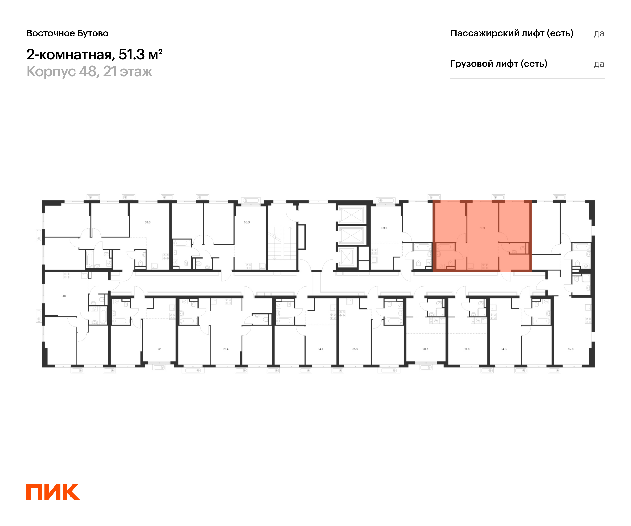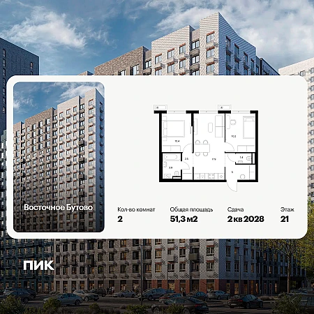 Продаётся 2-комн.квартира площадью 51.30 кв.м на 21 этаже 25 этажного дома (Корпус 48, секция 4) проекта ПИК Восточное Бутово. Светлый просторный подъезд на уровне земли, функциональная планировка, большие окна, с отделкой.
