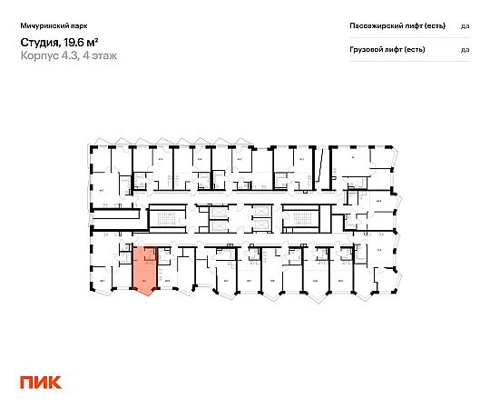 Продаётся квартира-студия площадью 19.60 кв.м на 4 этаже 31 этажного дома (Корпус 4.3, секция 2) проекта ПИК Мичуринский парк. Светлый просторный подъезд на уровне земли, функциональная планировка, большие окна, с отделкой.