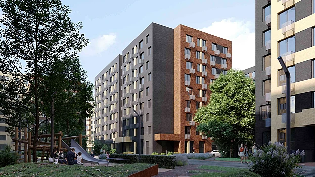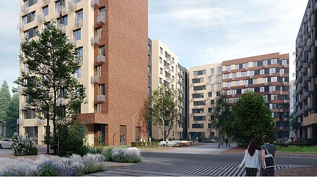 Квартал состоит из разноэтажных домов со ступенчатыми фасадами. Цветовая палитра проекта спокойная: оттенки белого и коричневого сочетаются с пастельным розовым и мятным.