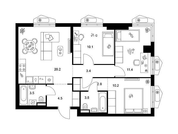 В корпусах 4.2-4.5 открытые балконы разнообразных форм: прямоугольные, фигурные. Все балконы выходят в тихий внутренний двор-парк. В эркерной части обоих корпусов предусмотрены лоджии.