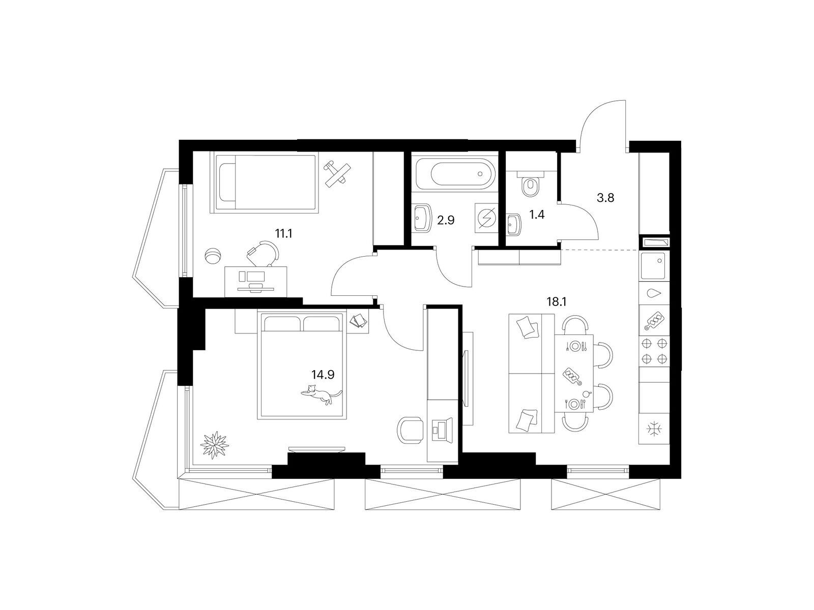 В корпусах 4.2-4.5 открытые балконы разнообразных форм: прямоугольные, фигурные. Все балконы выходят в тихий внутренний двор-парк. В эркерной части обоих корпусов предусмотрены лоджии.
