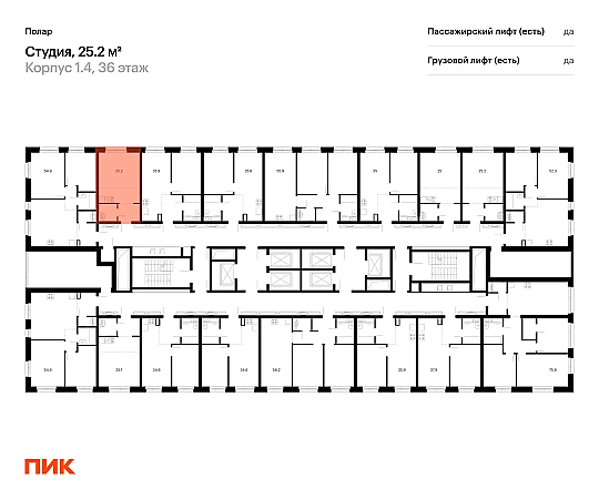 Продаётся квартира-студия площадью 25.20 кв.м на 33 этаже 53 этажного дома (Корпус 1.4, секция 1) проекта ПИК Полар. Светлый просторный подъезд на уровне земли, функциональная планировка, большие окна, с отделкой.