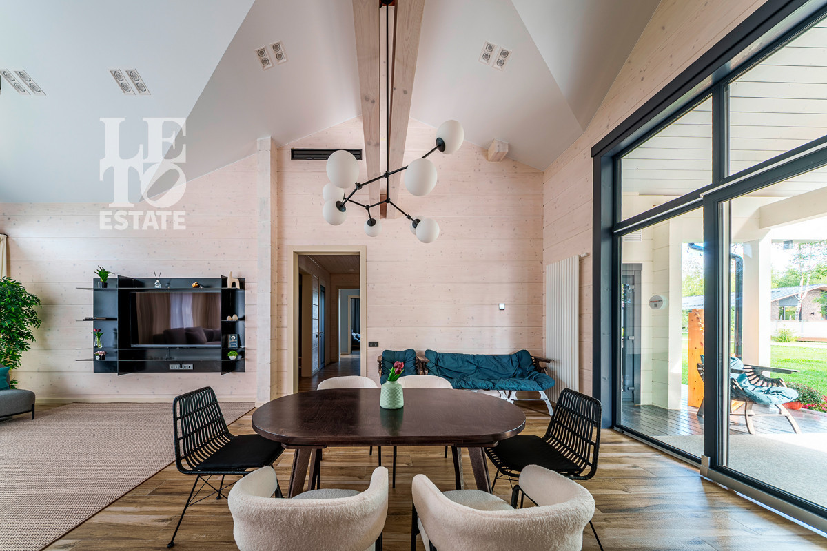 Дом построен компанией Holzbaken из клеёного бруса 365х202 на фундамента из железобетонных 4-метровых свай 200*200 мм с обвязкой клееным конструктивным брусом. Установлено панорамное остекление. Кровля кликфальц, крыша дополнительно утеплена, установлены снегозадержатели и водосточная система. В котельной установлены 2 котла: электрический и газовый, система водоочистки, вентиляционная система и система увлажнения воздуха.