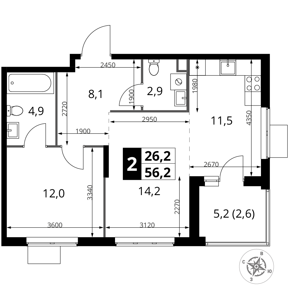Продаю 2-х комнатную квартиру, с мебелью и техникой, общей площадью 52,3 кв.м.