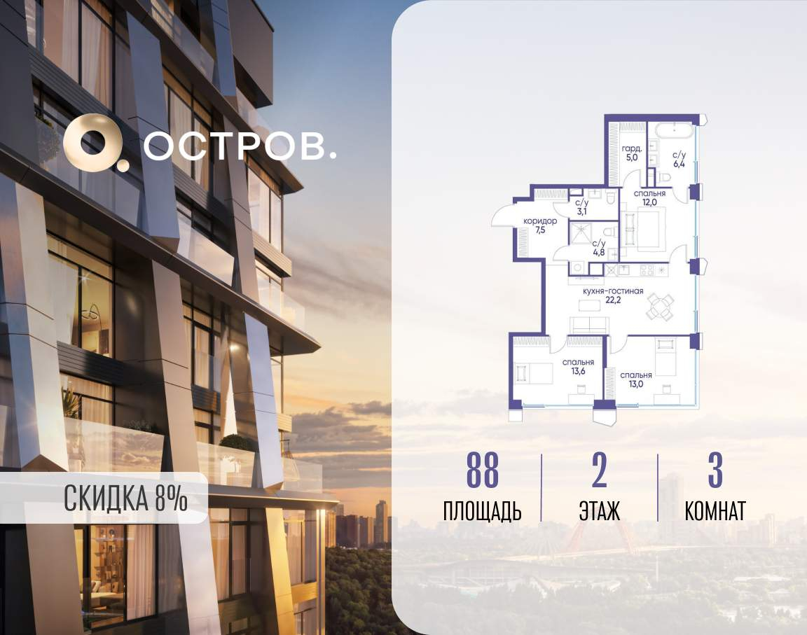 Продаётся 3-комн. квартира от застройщика: общая площадь 88.00 м, жилая 38.60 м, кухня 22.20 м, 2-й этаж, жилой квартал «Остров 12», корпус 3 (секция 1) . Срок сдачи: 1 квартал 2029 года.