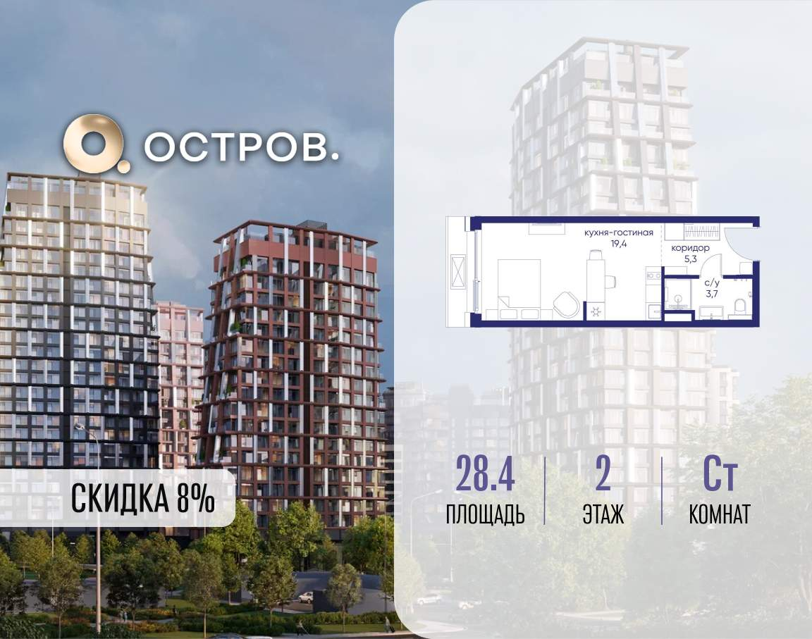Продаётся квартира от застройщика: общая площадь 28.40 м, жилая 14.40 м, кухня 5.00 м, 2-й этаж, жилой квартал «Остров 14», корпус 1 (секция 1) . Срок сдачи: 2 квартал 2029 года.