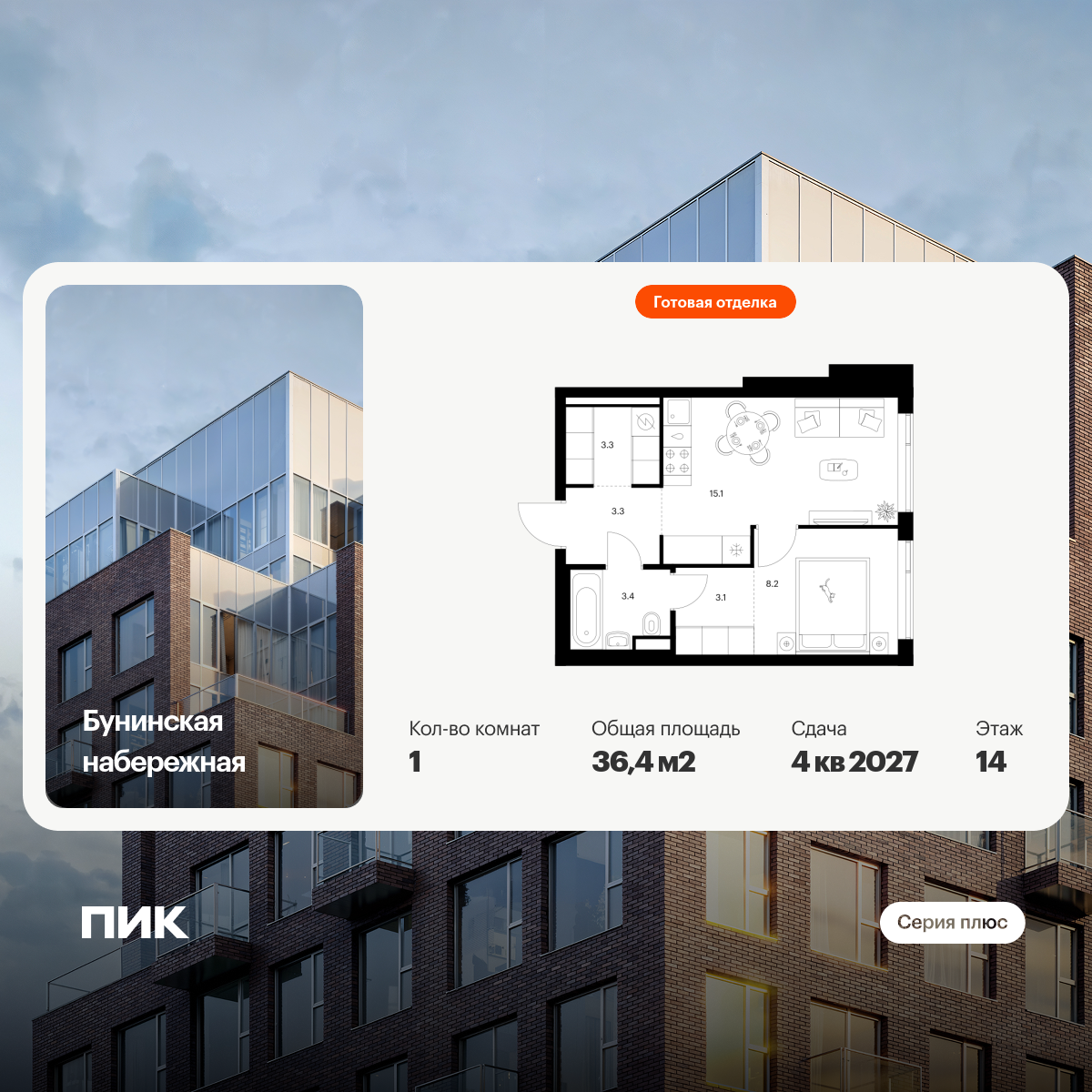 Продаётся 1-комн.квартира площадью 35.60 кв.м на 43 этаже 53 этажного дома (Корпус 1.4, секция 1) проекта ПИК Полар. Светлый просторный подъезд на уровне земли, функциональная планировка, большие окна, с отделкой.