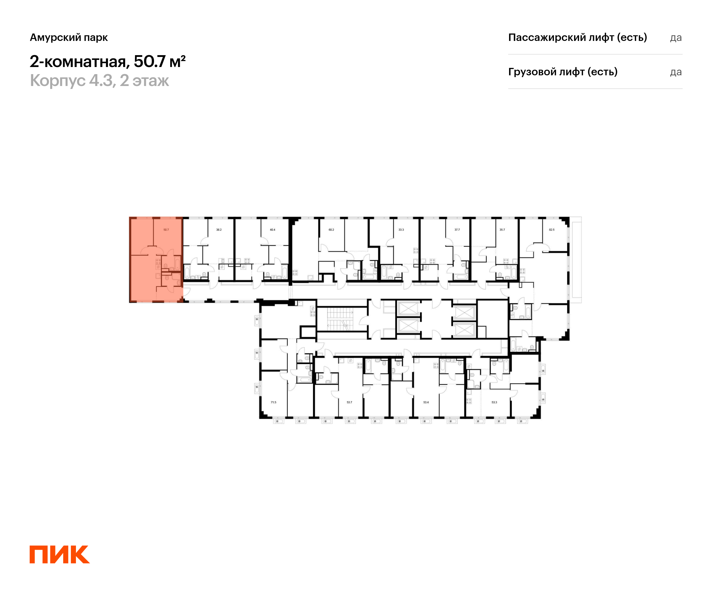 Продаётся 2-комн.квартира площадью 50.70 кв.м на 2 этаже 27 этажного дома (Корпус 4.3, секция 3) проекта ПИК Амурский парк. Светлый просторный подъезд на уровне земли, функциональная планировка, большие окна, с отделкой.