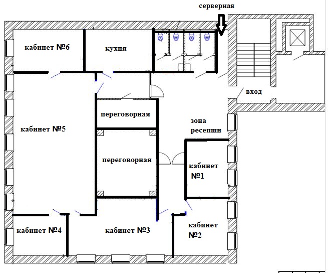 Планировка помещения на сегодняшний день: зона ресепшн, две переговорные, кухня (полностью оборудованная и со своим с/у), с/у, серверная, 6 кабинетов, возможно увеличение до 7.