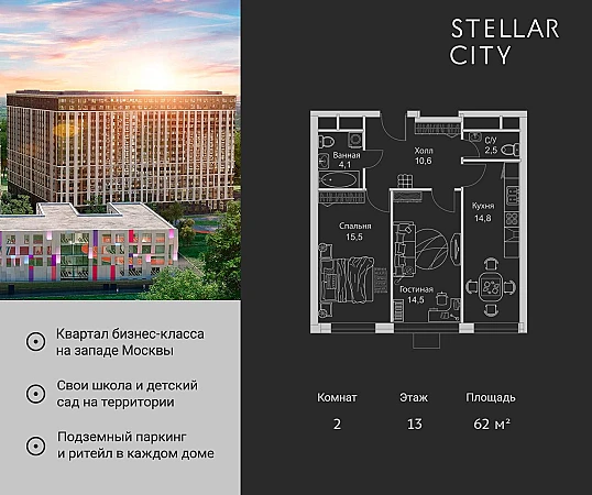 Stellar City — квартал в ЗАО Москвы вблизи инновационного центра Сколково. В окружении — 11 парков и природных зон, в том числе Долина реки Сетунь, Мещерский лес и парк развлечений The Rink.