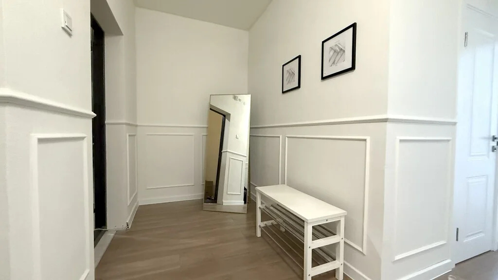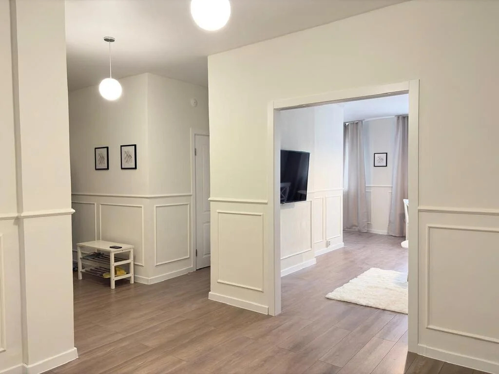 Интерьер выполнен в спокойных пастельных тонах, стены украшены декоративными молдингами, создающими атмосферу утонченного уюта и гармонии.