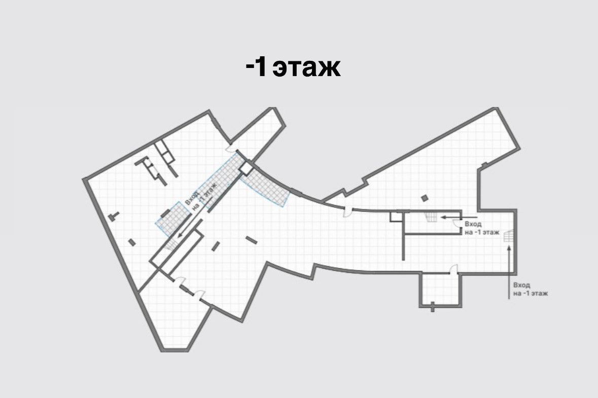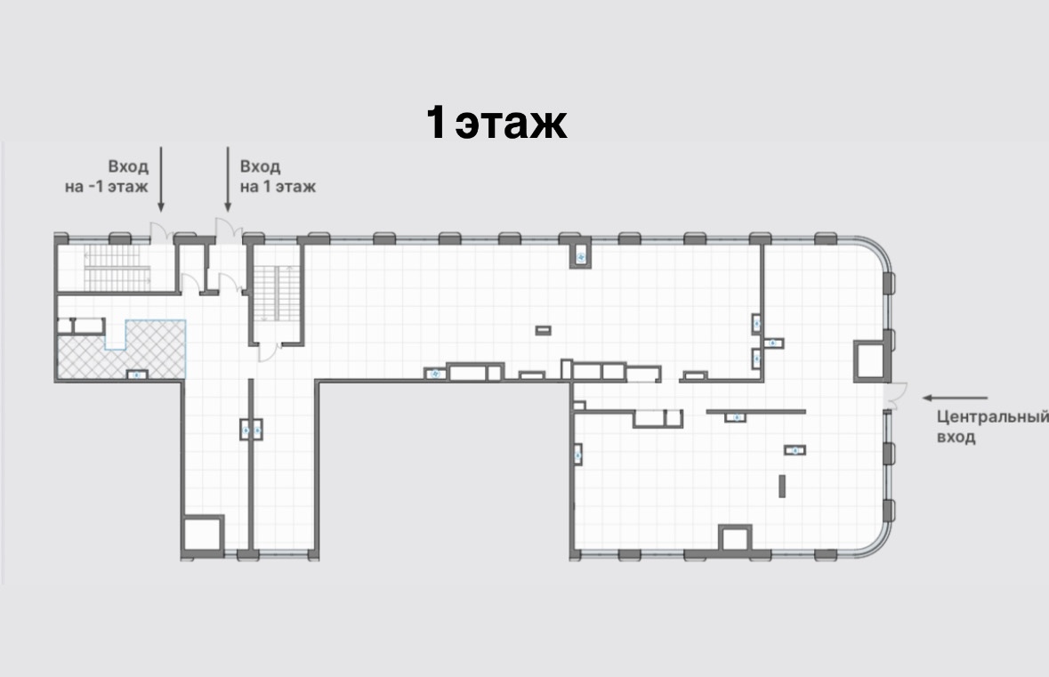 Общая площадь: 1232,8 м2 (-1 этаж: 726,2 м2; h: 3,8 м; 1 этаж: 506,6 м2; h: 4м)