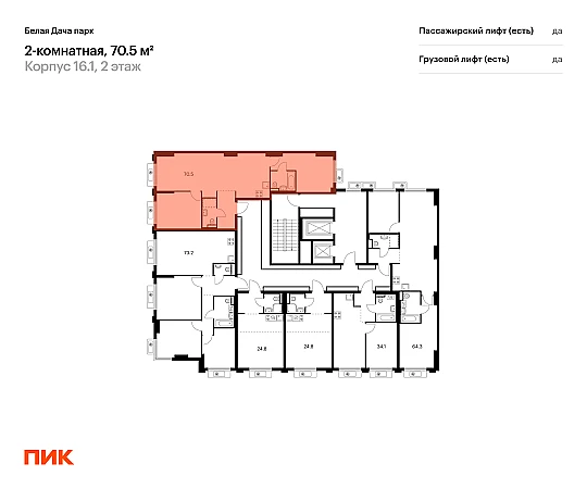 Продаётся 2-комн.квартира площадью 70.50 кв.м на 2 этаже 19 этажного дома (Корпус 16.1, секция 3) проекта ПИК Белая Дача парк. Светлый просторный подъезд на уровне земли, функциональная планировка, большие окна, с отделкой.