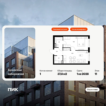 Продаётся 1-комн.квартира площадью 37.80 кв.м на 11 этаже 16 этажного дома (Корпус 2.6/1.2, секция 2) проекта ПИК Бунинская набережная. Светлый просторный подъезд на уровне земли, функциональная планировка, большие окна, с отделкой.