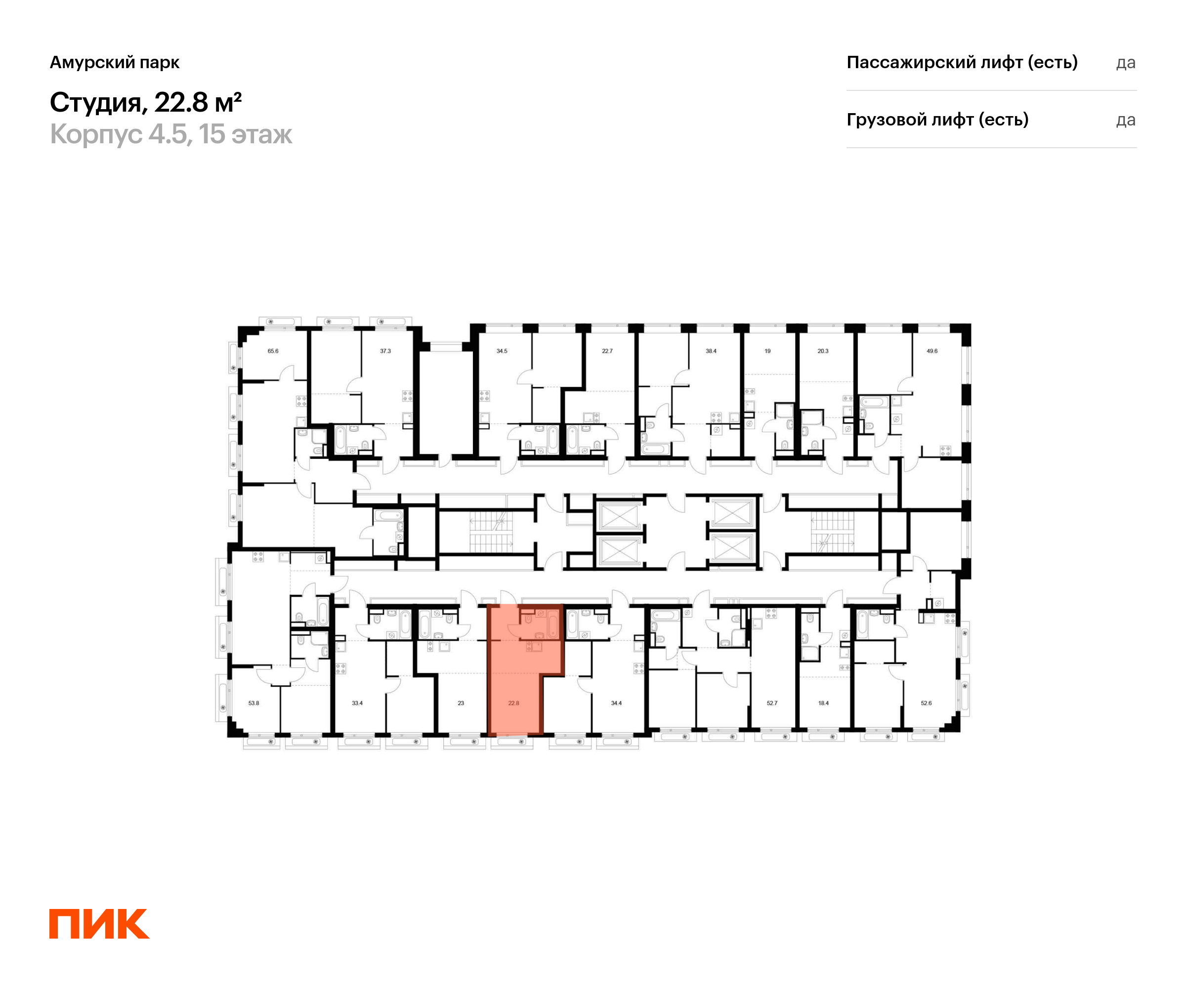 Продаётся квартира-студия площадью 22.80 кв.м на 15 этаже 27 этажного дома (Корпус 4.5, секция 6) проекта ПИК Амурский парк. Светлый просторный подъезд на уровне земли, функциональная планировка, большие окна, с отделкой.