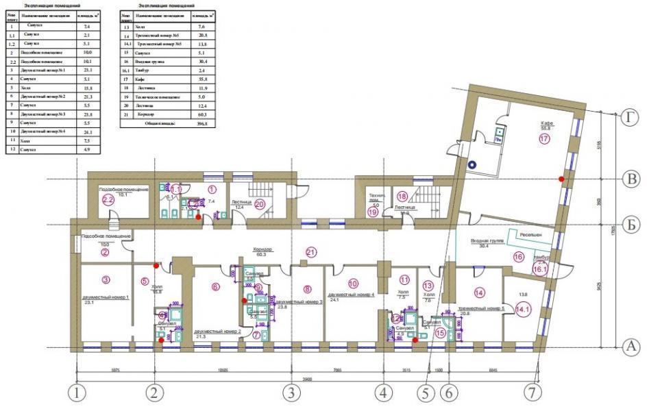 действующая гостиница (3 этаж), капсульный отель (2 этаж), офисные помещения (1 этаж), оборудованное кафе.
