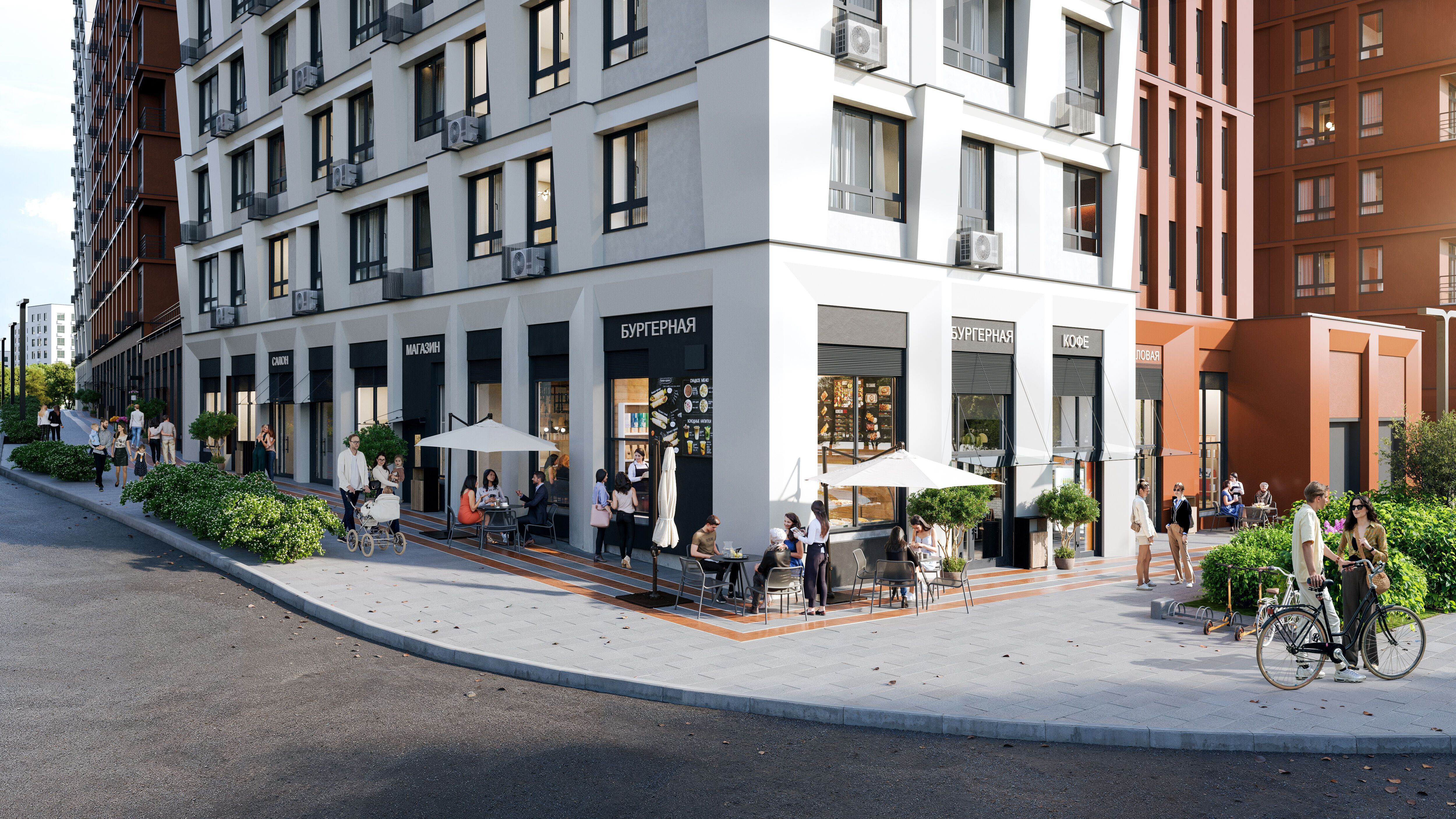 Здесь реализуется концепция «15-минутный город». Проект «Деснарьечье» предусматривает создание полноценной социальной, торговой и развлекательной инфраструктуры на первых этажах и в шаговой доступности от домов. Предусмотрен стрит-ритейл на набережной.