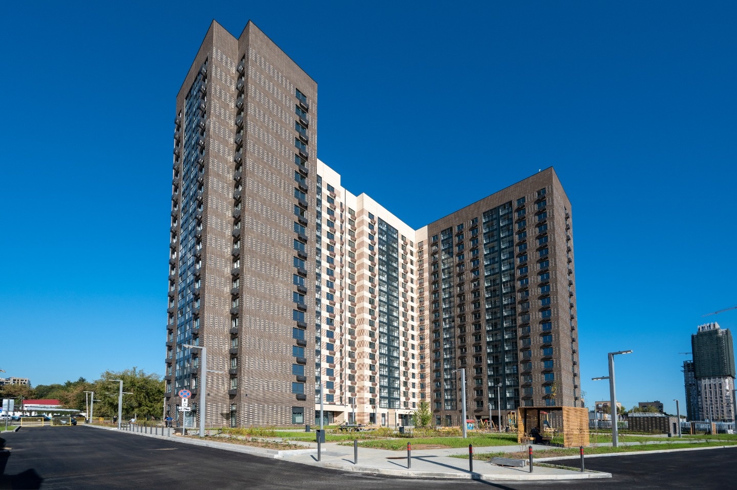 Проект включает два жилых квартала из девяти корпусов различной высоты с подземным паркингом, на крыше которого располагается благоустроенное общественное пространство.