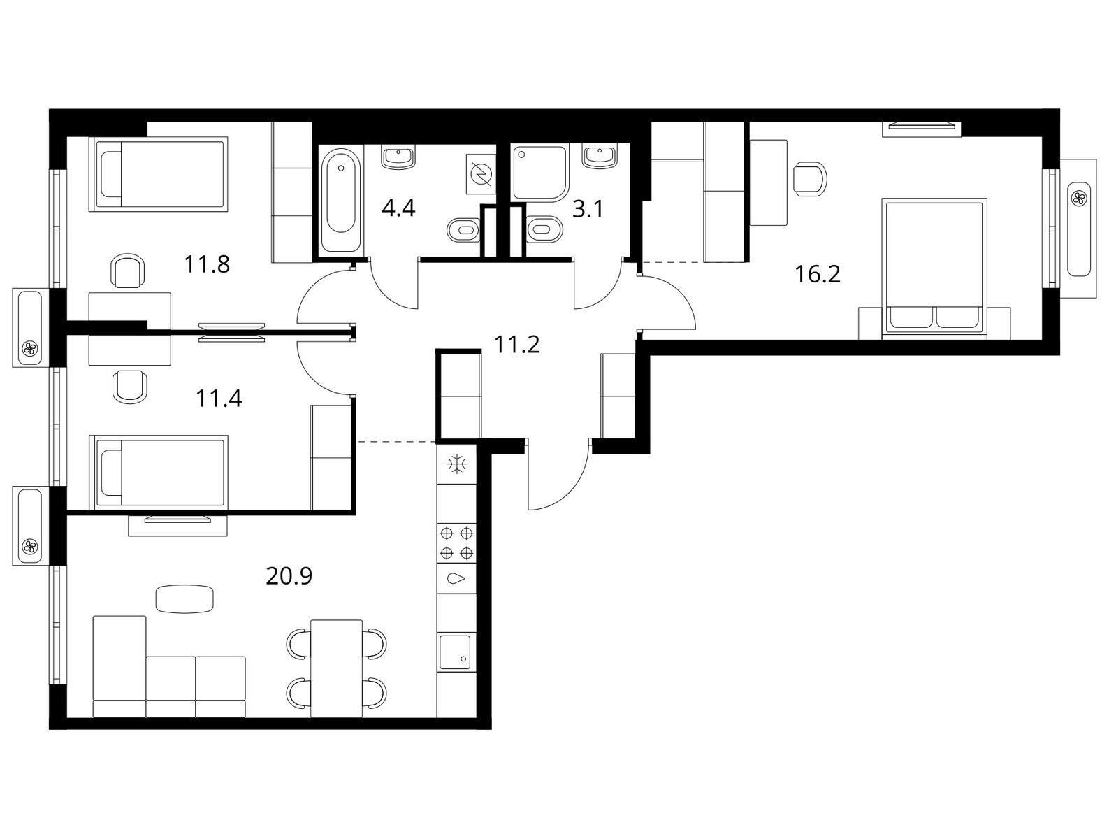 В проекте широкий выбор продуманных и функциональных планировок для разных сценариев жизни. Мы предусмотрели мастер-спальни с собственной ванной и выделенной зоной для гардероба. Также есть варианты с компактной кухней-нишей, постирочной и сквозным санузлом.