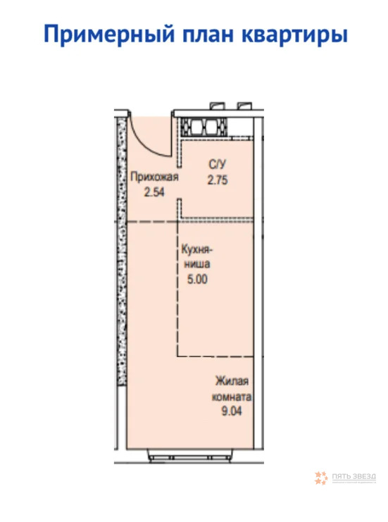 Площадь: общая ~ 19. 3 м2, жилая ~ 9 м2, кухня-ниша ~ 5 м2.
